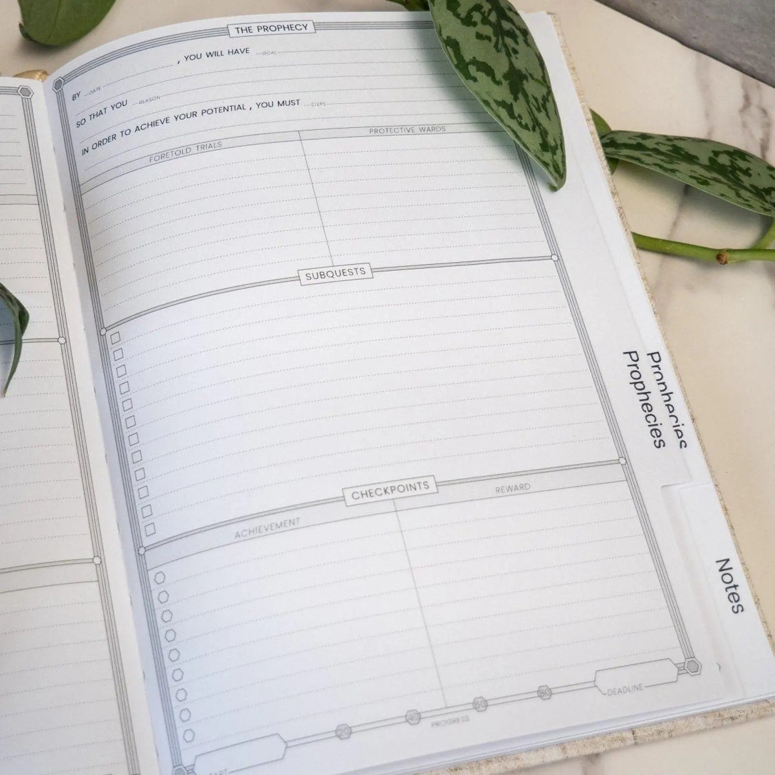 Embark on your daily journey with the LifeQuest Planner — a nerdy, undated weekly and monthly planner designed to turn everyday tasks into epic quests. Perfect for gamers, fantasy lovers, and anyone who enjoys making productivity fun, this linen hardcover journal brings adventure into organization.